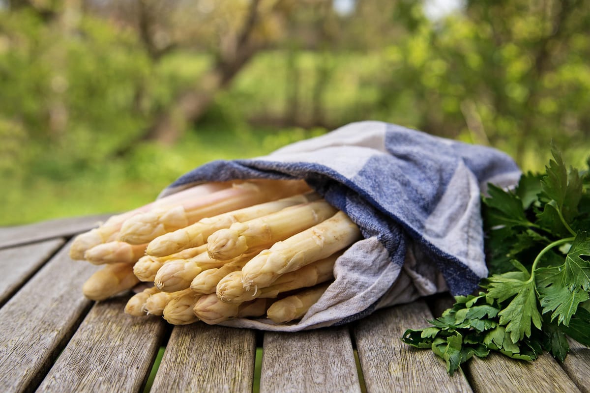 Die Spargelstangen vorsichtig schälen und holzige angetrocknete Enden abschneiden.