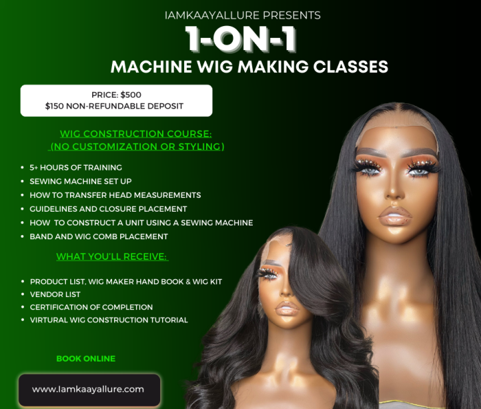 4Lace Wig Install 11 Hands On Training Ajs Doll House. MUST be able to provide a live model with a basic braid foundation of 8-12 braids for the course. Wig classes will be booked through the site with a 30 deposit of the total amount of the class with the remaining due the day of the class.
